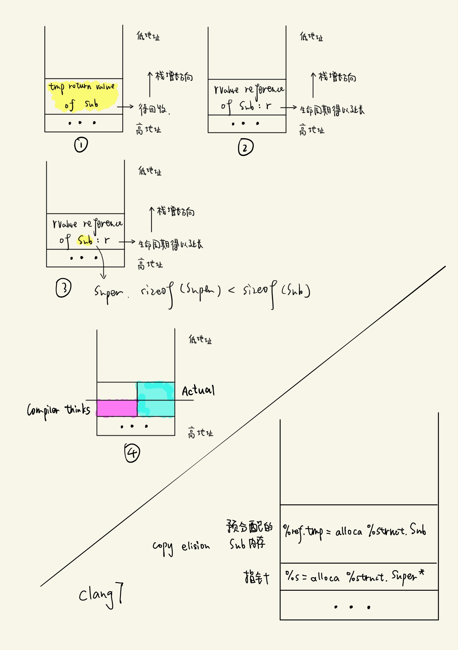 标准没有规定引用必须实现成指针,因而上图斜上方的实现方法在 prvalue 的场景下也是可行的,但这种实现方法就必须拒绝 polymorphic prvalue reference ,否则运行期会出现非预期的行为