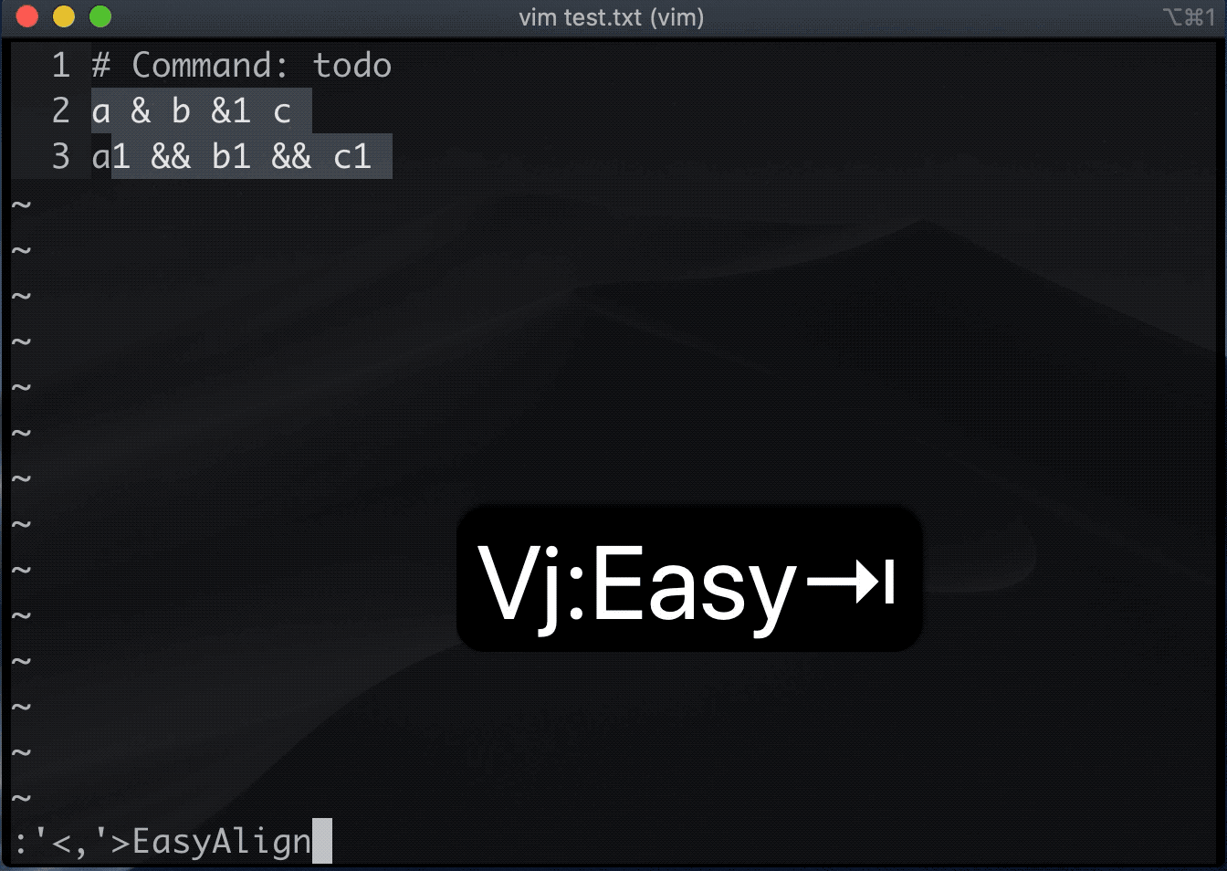 用 Shift-V 或 Ctrl-V 进入 Visual 模式,选中待对齐的文本区域,敲击 :EasyAlign 执行对齐命令。