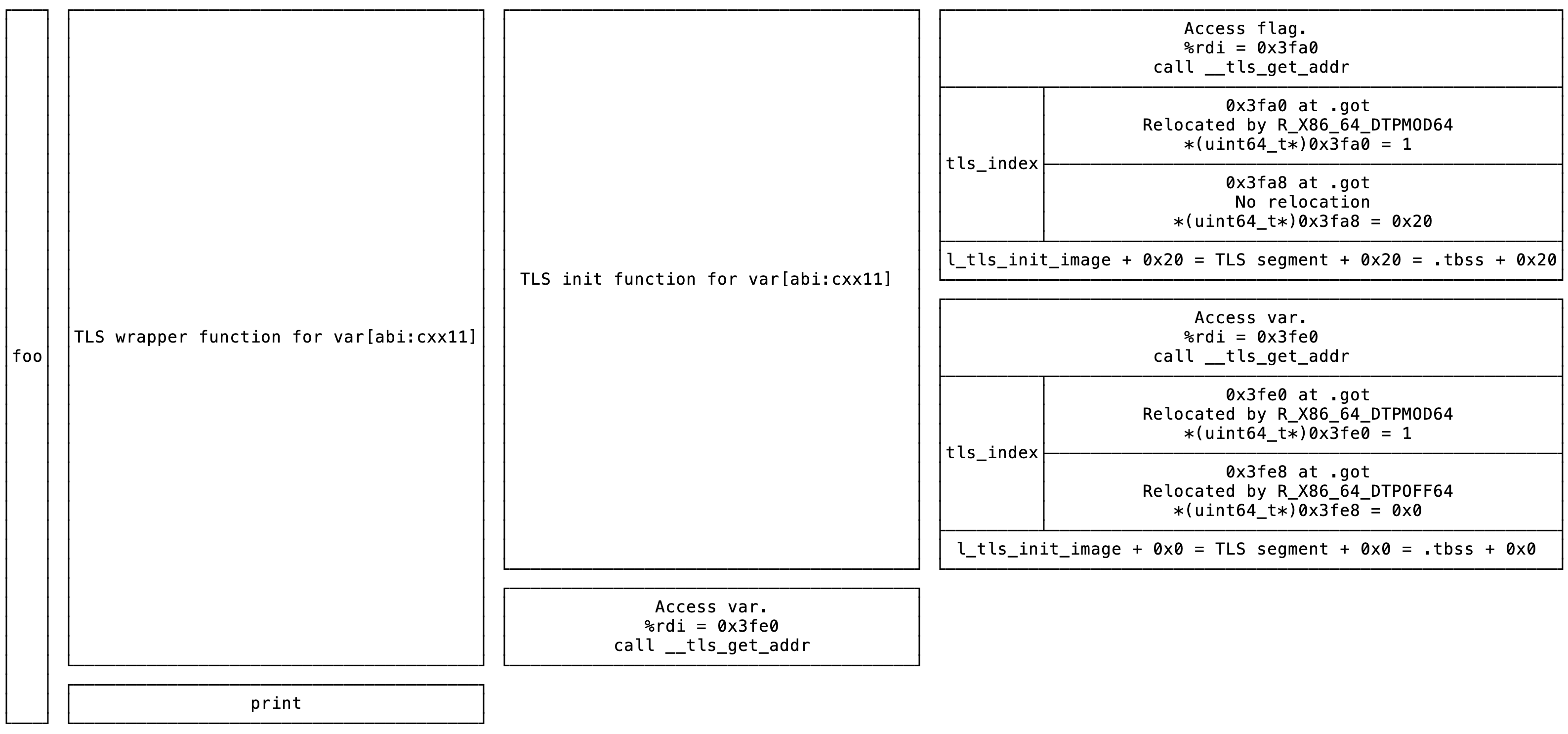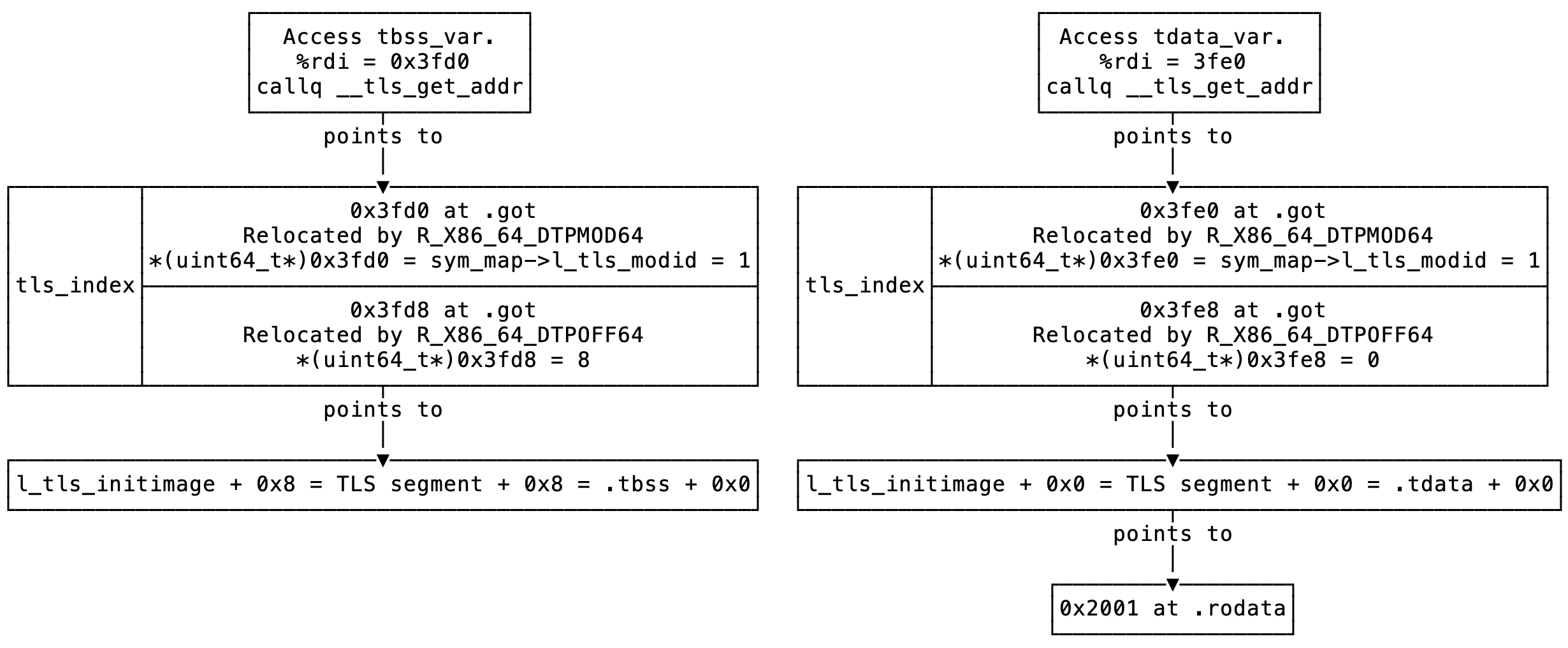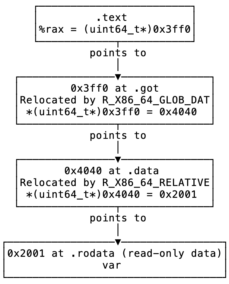 # readelf --wide --relocs libfoo.so Relocation section '.rela.dyn' at offset 0x598 contains 13 entries: Offset Info Type Symbol's Value Symbol's Name + Addend 0000000000004040 0000000000000008 R_X86_64_RELATIVE 2001 0000000000003ff0 0000000c00000006 R_X86_64_GLOB_DAT 0000000000004040 var + 0
