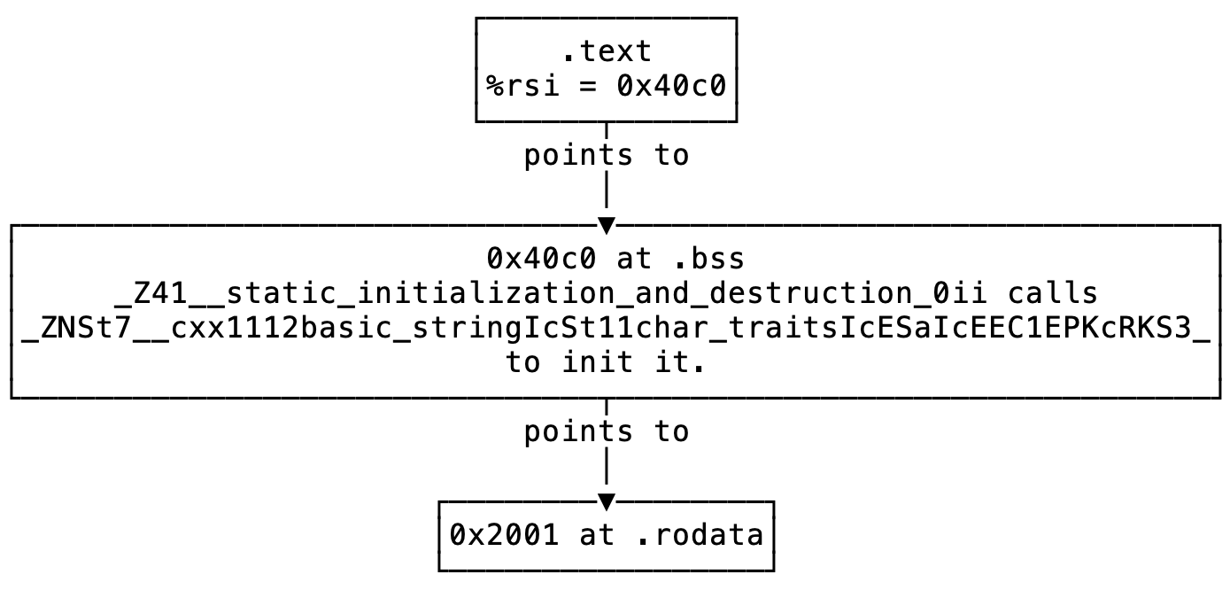 (gdb) bt #0 0x00007ffff7f3304b in std::__cxx11::basic_string<char, std::char_traits<char>, std::allocator<char> >::basic_string(char const*, std::allocator<char> const&) () from /usr/lib/x86_64-linux-gnu/libstdc++.so.6 #1 0x00007ffff7fcb21c in __static_initialization_and_destruction_0 (__initialize_p=1, __priority=65535) at foo.cpp:2 #2 0x00007ffff7fcb27a in _GLOBAL__sub_I_foo.cpp(void) () at foo.cpp:5 #3 0x00007ffff7fe3d4c in call_init (l=<optimized out>, argc=argc@entry=1, argv=argv@entry=0x7fffffffece8, env=env@entry=0x7fffffffecf8) at dl-init.c:72 #4 0x00007ffff7fe3e32 in _dl_init (main_map=0x7ffff7ffe1a0, argc=1, argv=0x7fffffffece8, env=0x7fffffffecf8) at dl-init.c:119 #5 0x00007ffff7fd60ca in _dl_start_user () from /root/glibc/build/install/lib/ld-linux-x86-64.so.2