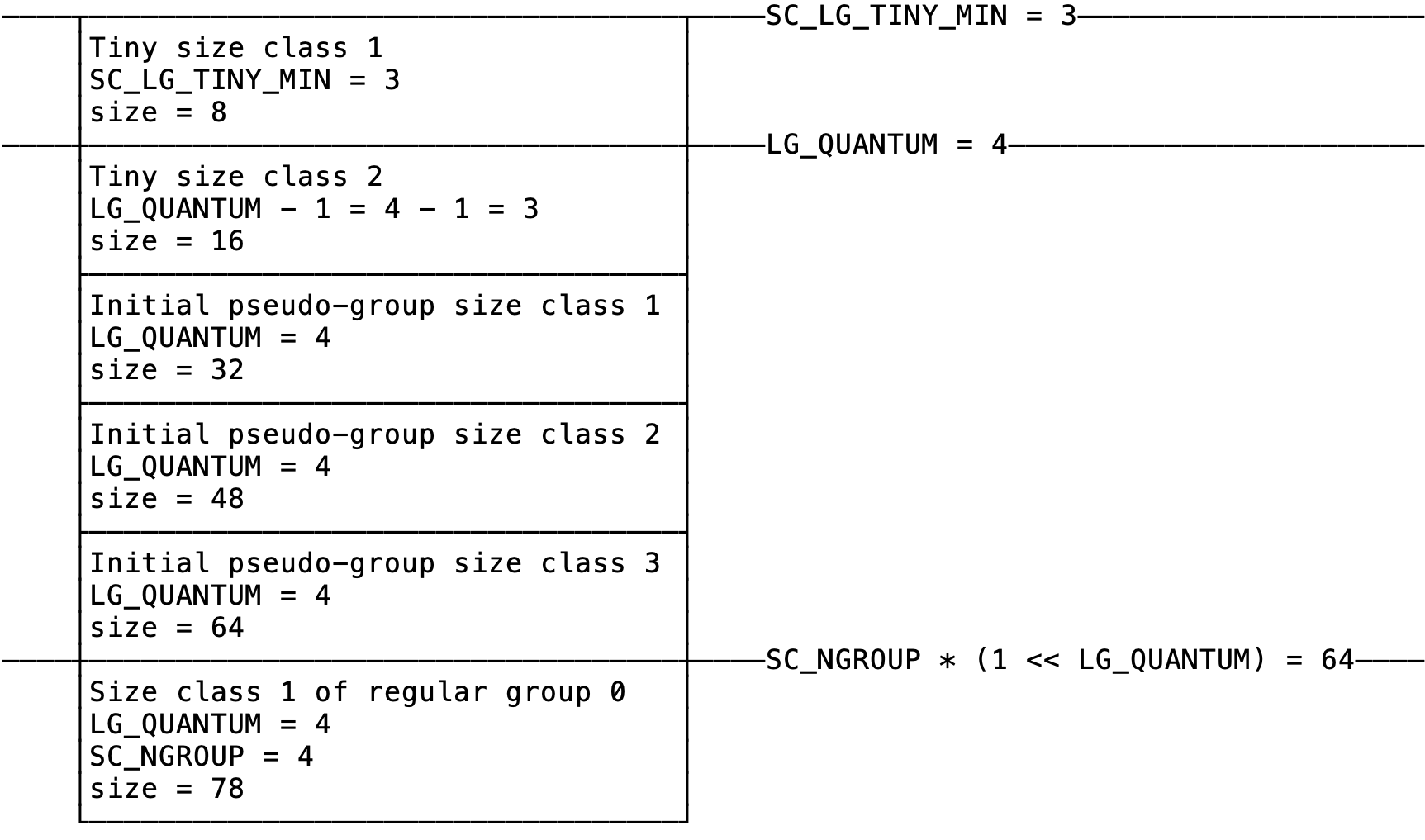 pow(2, SC_LG_NGROUP) = 4个等宽区间,得到 (16, 20] / (20, 24] / (24, 28] / (28, 32] 。如果我们将一个内存页切分成多个连续的、大小相同的 objects ,那么部分大小为 20 bytes 的 objects 的起始地址不能对齐到pow(2, LG_QUANTUM) = 16个字节。所以对这部分区间要做特殊处理,从而产生 initial pseudo-group ,initial pseudo-group 内的每两个相邻的 size classes 相距pow(2, LG_QUANTUM) = 16个字节。 - 对于「大小」小于「对齐要求」(即
