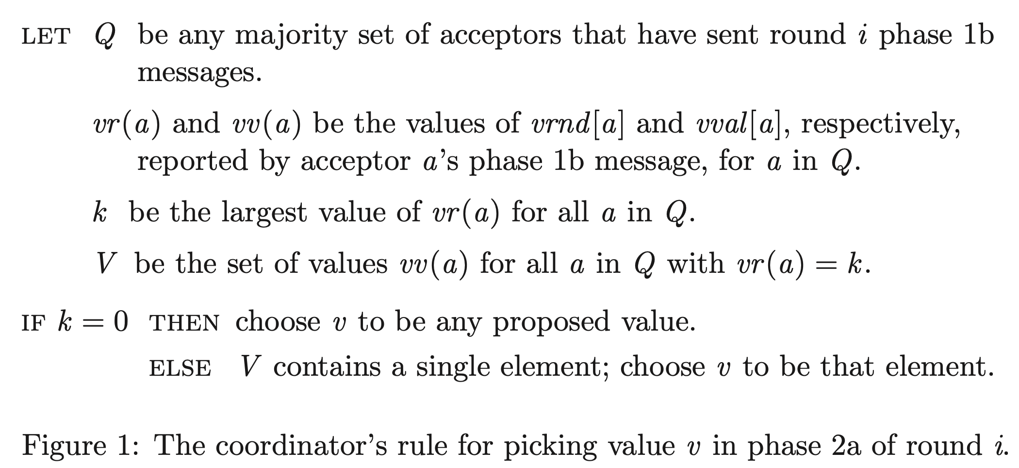 - In a fast round \(i\), if the coordinator can pick any proposed value in phase 2a, then instead of picking a single value, it may instead send a special phase 2a message called an any message to the acceptors. When an acceptor receives a phase 2a any message, it may treat any proposer's message proposing a value as if it were an ordinary round \(i\) phase 2a message with that value. (However, it may execute its round \(i\) phase 2b action only once, for a single value.)