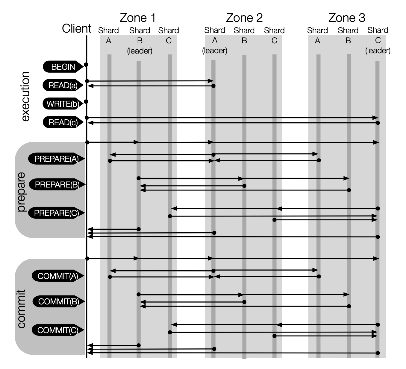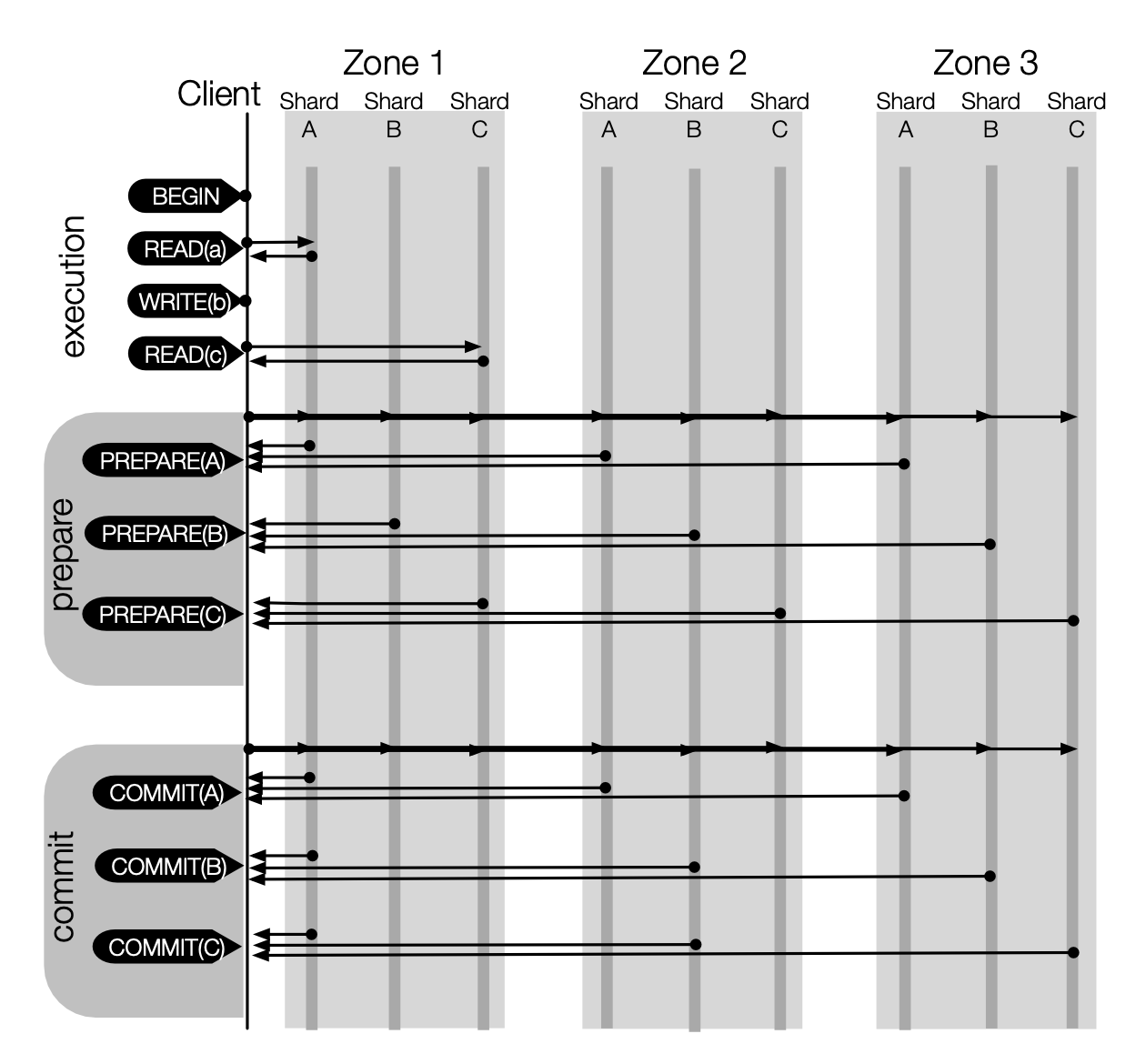 - Atomicity: If a transaction commits at any participating shard, it commits at them all. This is usually secured by the two-phase commit (2PC) mechanism; in cases of client or coordinator failures, the coordinator recovery protocol ensures that a backup coordinator will reach the same decision. Essentially, the integrity of atomicity is maintained by 2PC along with a strict adherence to making no more than one decision per transaction.