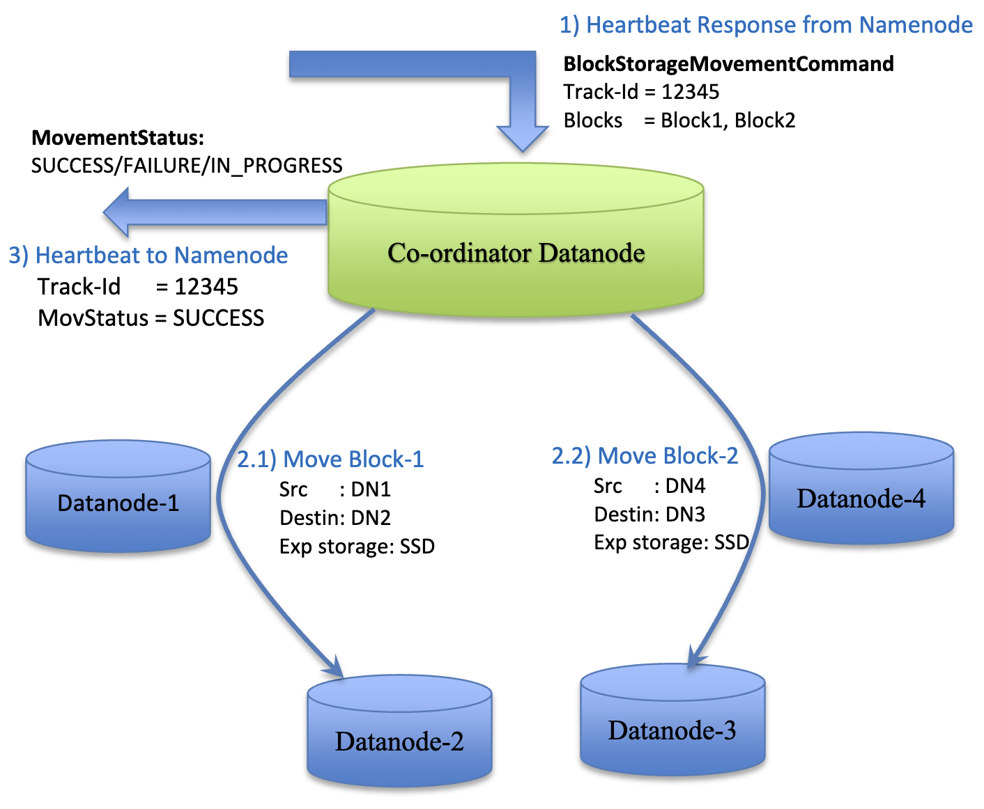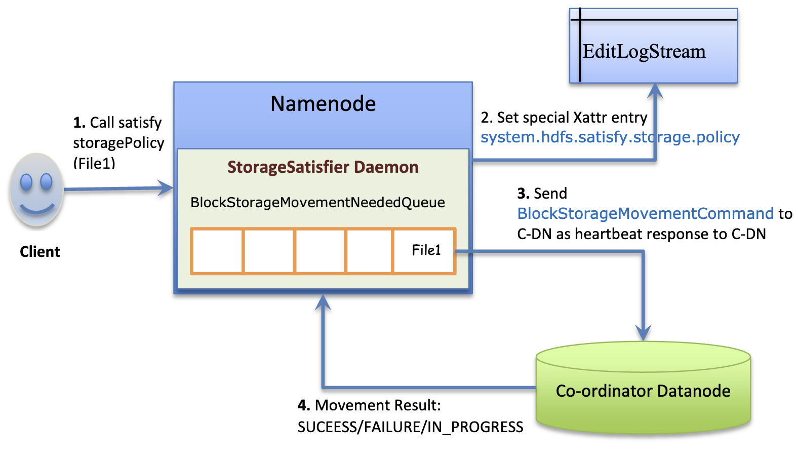 Users have two options to move blocks according to a new policy. The first option is the HDFS-10285: Storage Policy Satisfier in HDFS. The following figures illustrate the basic workflow of SPS: