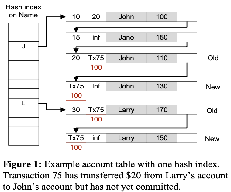BeginandEndfields of the new and old versions, respectively. (One bit in the field indicates the field's current content.)Now suppose transaction 75 commits with end timestamp 100. It then returns to the old and new versions and sets the